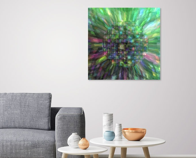 This abstract sunflower is bursting with a multitude of bright colors and a noticeable predominant light green color throughout.